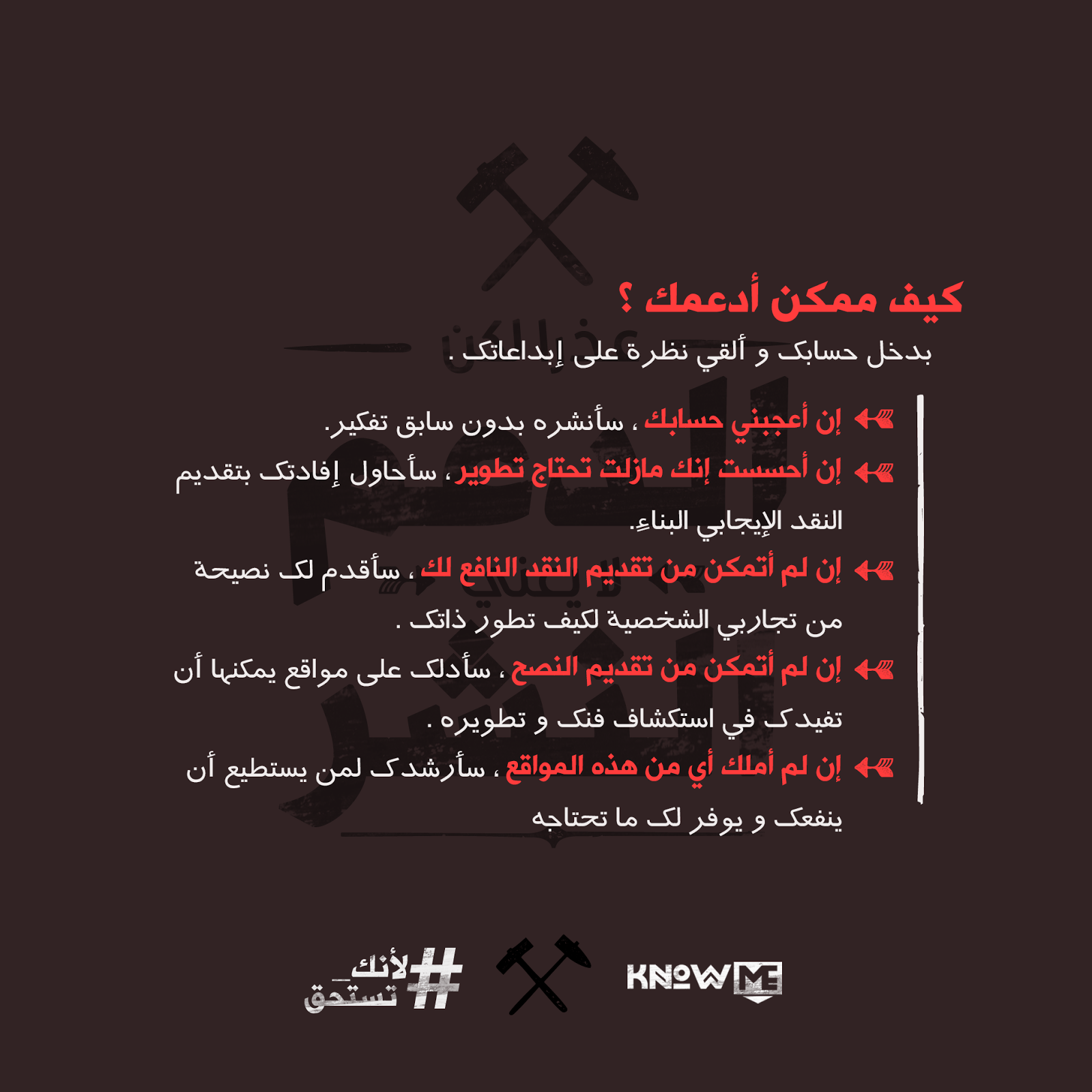 انطلاقا من هذا نحن نرغب بأن تعود كلمة دعم إلى معناها الحقيقي لذلك سنبدأ حملة بعنوان #لأنك_تستحق إذ إن كل شخص يطلب منا دعم سنواجه طلبه بسؤال وهو ” كيف ممكن ندعمك بدون نشر ؟ ” السبب في ذلك هو لأنك تستحق من ينصحك و يدعمك في تطوير إبداعاتك أكثر من مجرد نشر حسابك و الذي قد لا ينفعك إذ إن الخطوة الأولى لكسب المتابعين هي أن تكون أعمالك ملفته و متقنة .