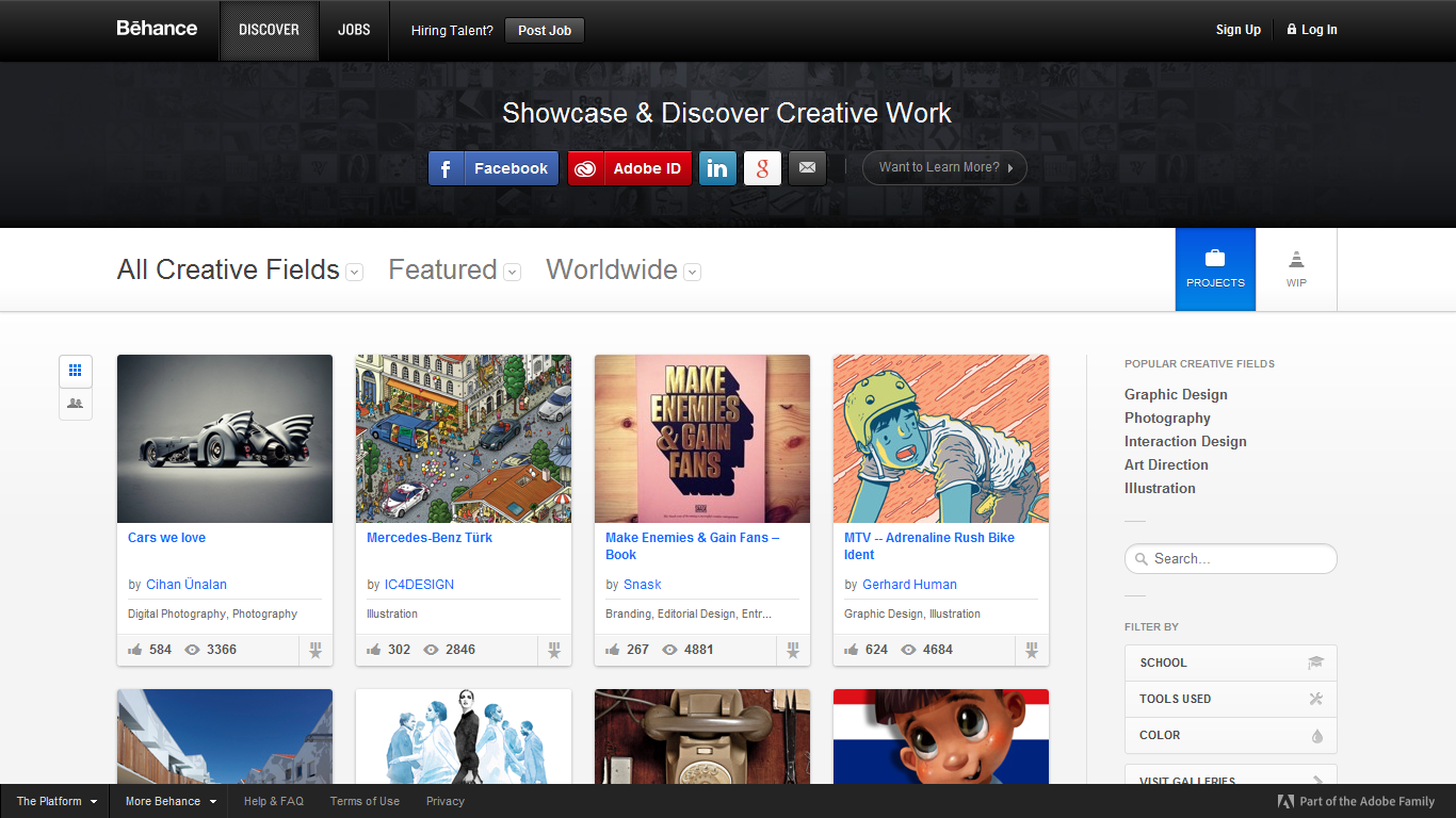 يمكنكم من عرض أعمالكم المكتملة أو الأعمال التي لاتزال قيد الإنشاء. سجل كـ Prospect إذا كنت تسعى لإيجاد وظيفة ,أو كـ Scout إن كنت تبحث لتوظيف المواهب.